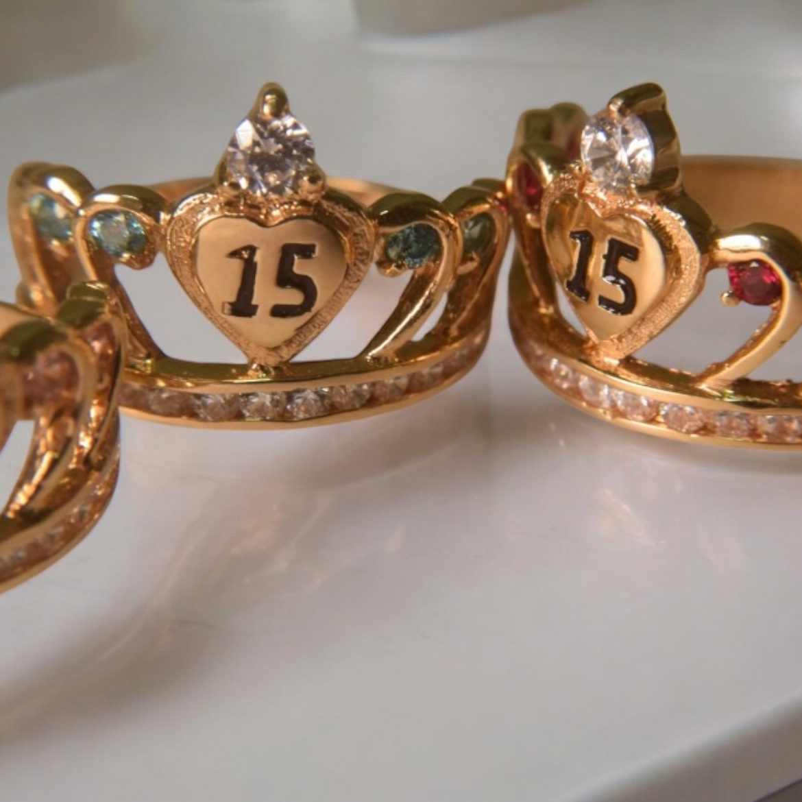Anillo personalizado para quinceañeras. Fabricación nacional en oro amarillo de 18 Kilates. REF. HS3036