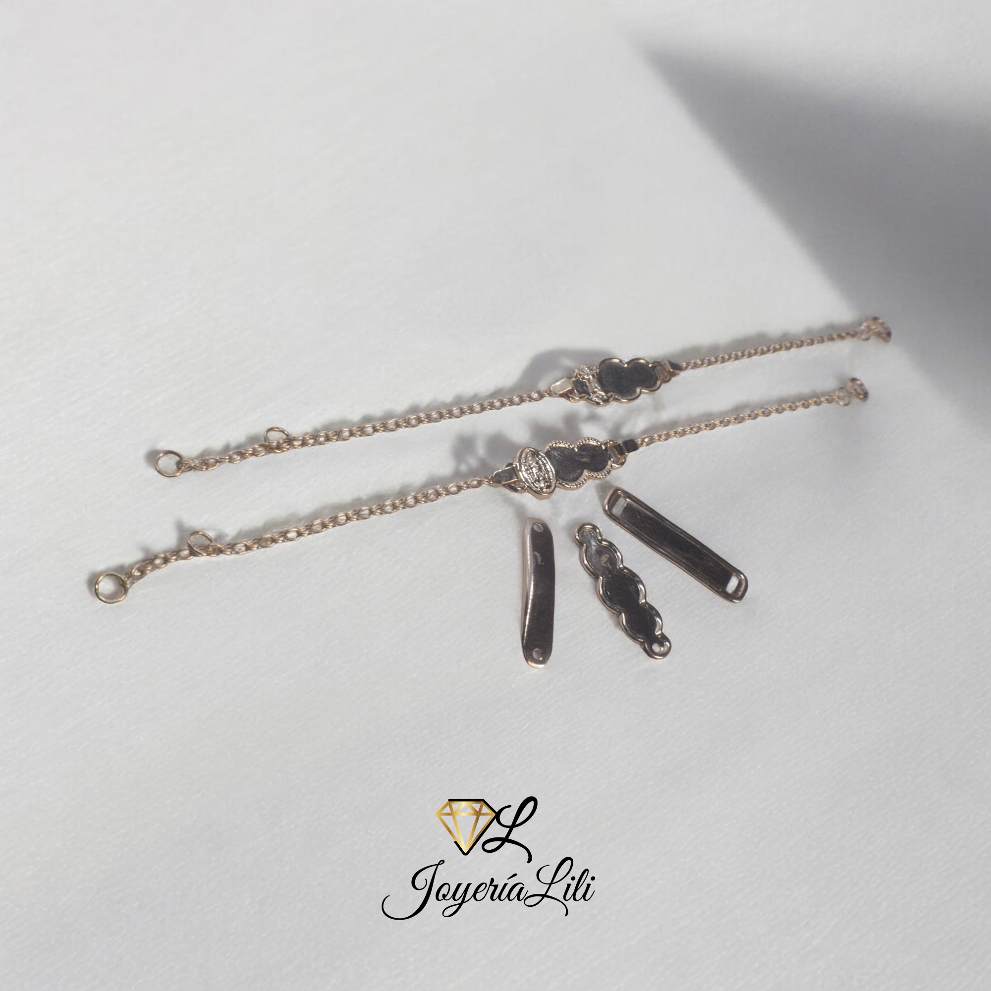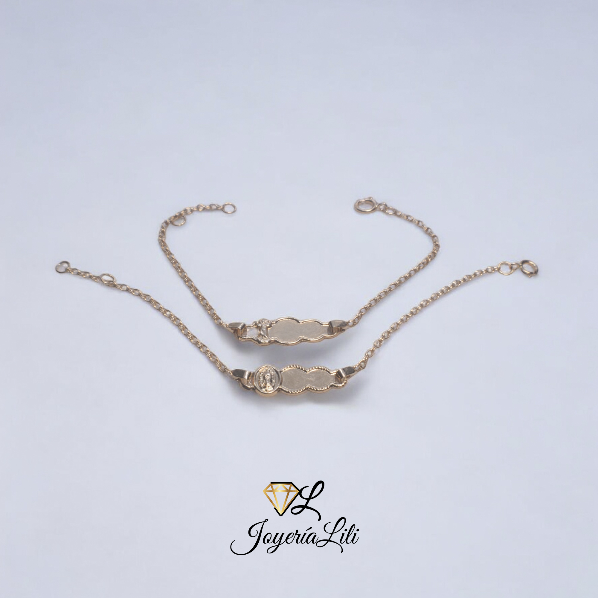 Pulsera para bebe, Fabricación nacional en oro amarillo de 18 Kilates Te llega en cualquier estilo de placa, de acuerdo a la disponibilidad en el momento. *El largo y el peso son aproximados.