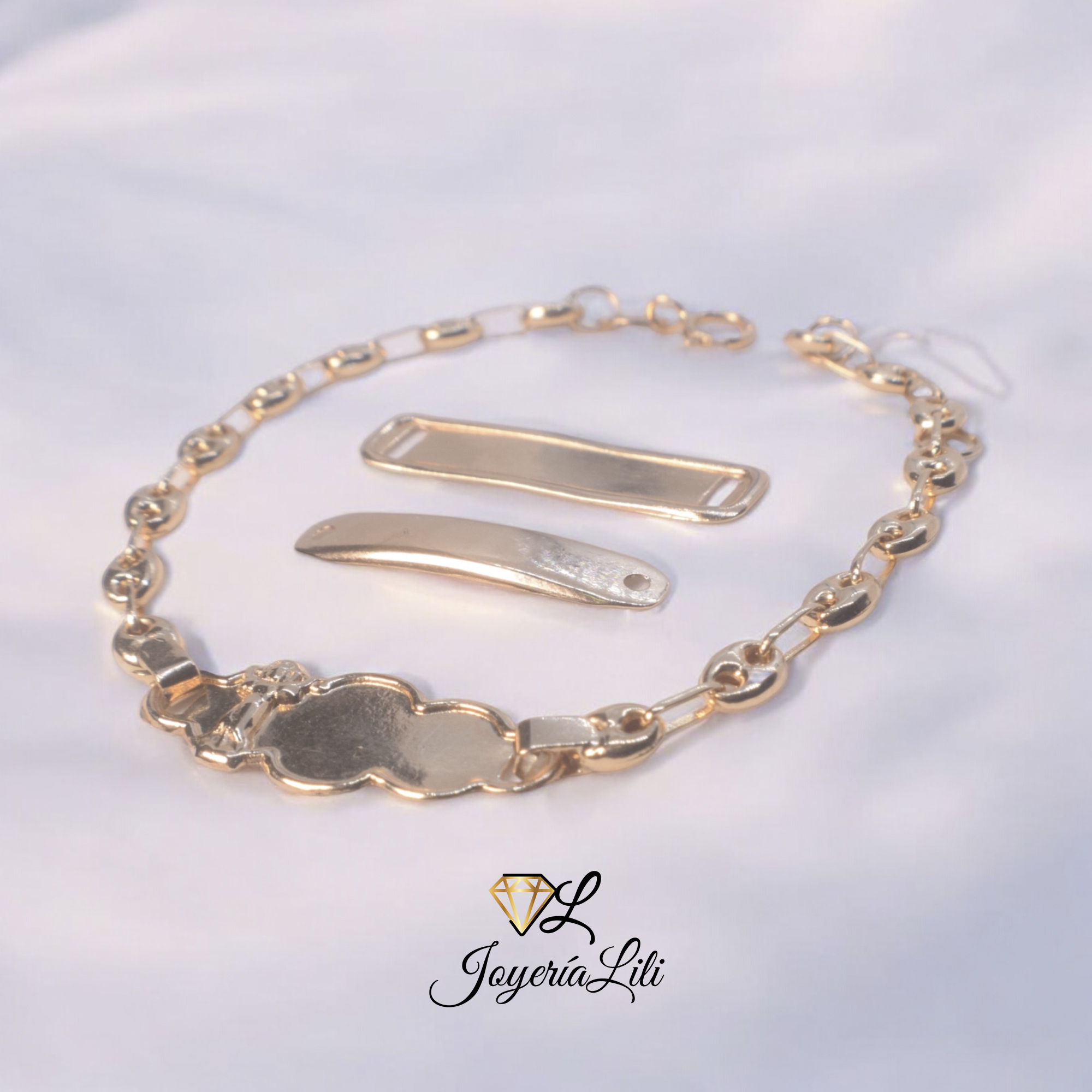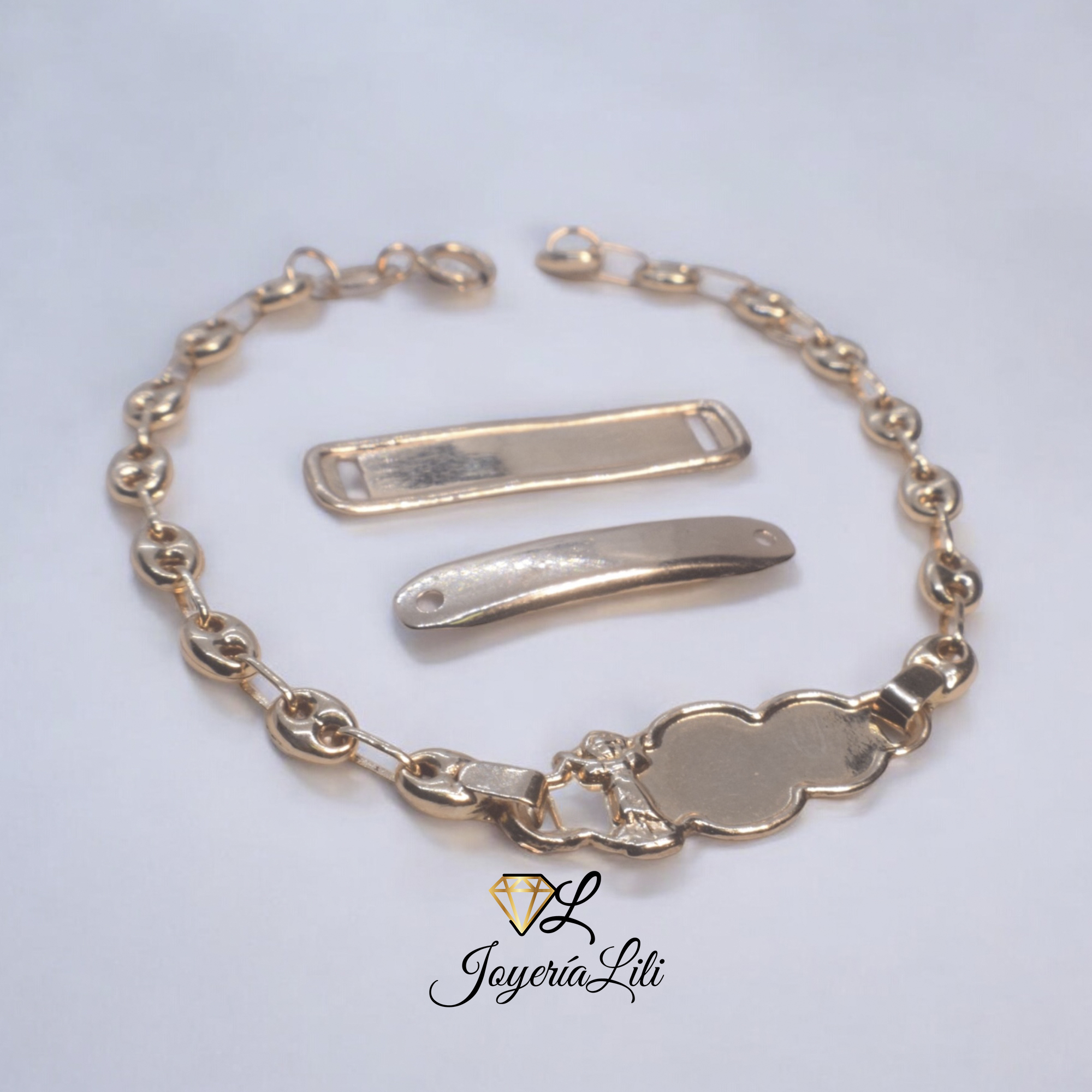 Pulsera para bebe, Fabricación nacional en oro amarillo de 18 Kilates Te llega en cualquier estilo de placa, de acuerdo a la disponibilidad en el momento. *El largo y el peso son aproximados.